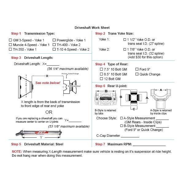 Precision Shaft Technology PST560-KIT – 53-1/8″ Y-length or 55-3/4″ – 56-1/4″ X-length driveshaft. Driveshafts are custom built from 3″ DOM steel tubing. Each drive shaft is precision crafted and electronically balanced for maximum 6000 RPM use. Transmission slip yoke and rear u-joint are included. Painted with gloss white finish. We stock all steel driveshafts from 43-5/8″ to 53-1/8″ Y-length by 1/2″ increments NOTE: Use worksheet to collect all dimensions before ordering. If you have questions please call us 800-278-2692.