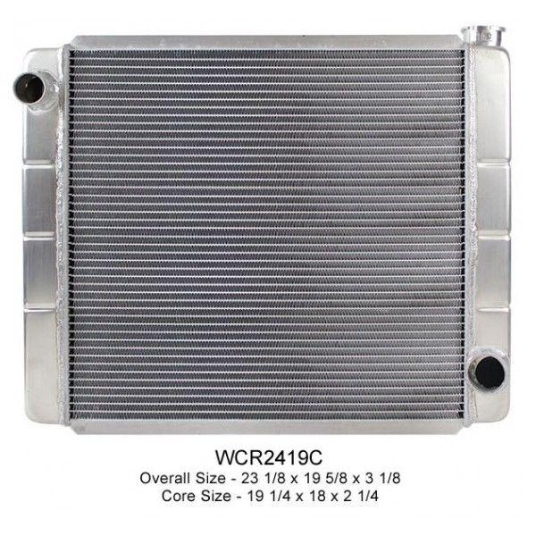 Wicked Cool 2419C – Pro series radiators are top quality aluminum construction for long life. Maximum cooling with minimum weight. Core has two rows of 1″ tubes. Top hose connection is 1-1/2″ on drivers side, bottom is 1-3/4″ on passengers side. Measurements are total width including tanks and total core height.